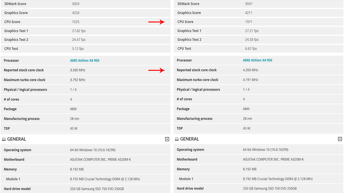 Yaptığımız sentetik testlerde Cinebench R15 ile yetinmeyip Time Spy testi de gerçekleştirdik. 4.2 GHz değerine aşırtılan bu test sonucunda ise Athlon X4 950, stok hızlara göre 446 puan fazla vererek 1971 puana ulaştı. (Yaklaşık %30’a yakın performans artışı)