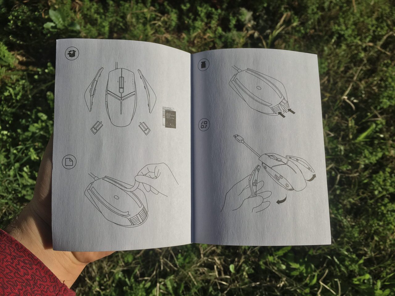 Mouse’u çıkarıp, son kapağı kaldırdığımızda dip kısımda karşımıza kullanım kılavuzu ve garanti belgesi çıkıyor. Kullanım kılavuzunu açtığımızda karşımıza bazı bilgiler çıkıyor. Bunlar mouse’u kullanmadan önce mouse’un altındaki plastikleri çıkarmamız gerektiğine dair uyarı, ağırlıkların nasıl takılacağına dair bilgi ve mıknatıslı eklentilerinin nasıl çıkarılıp takılacağına dair bilgiler bulunuyor. Son sayfasında ise mouse’un USB portuna nasıl takılması gerektiği, son olarak ise mouse’un driverlarının nereden yüklenmesi gerektiği belirtilmiş.