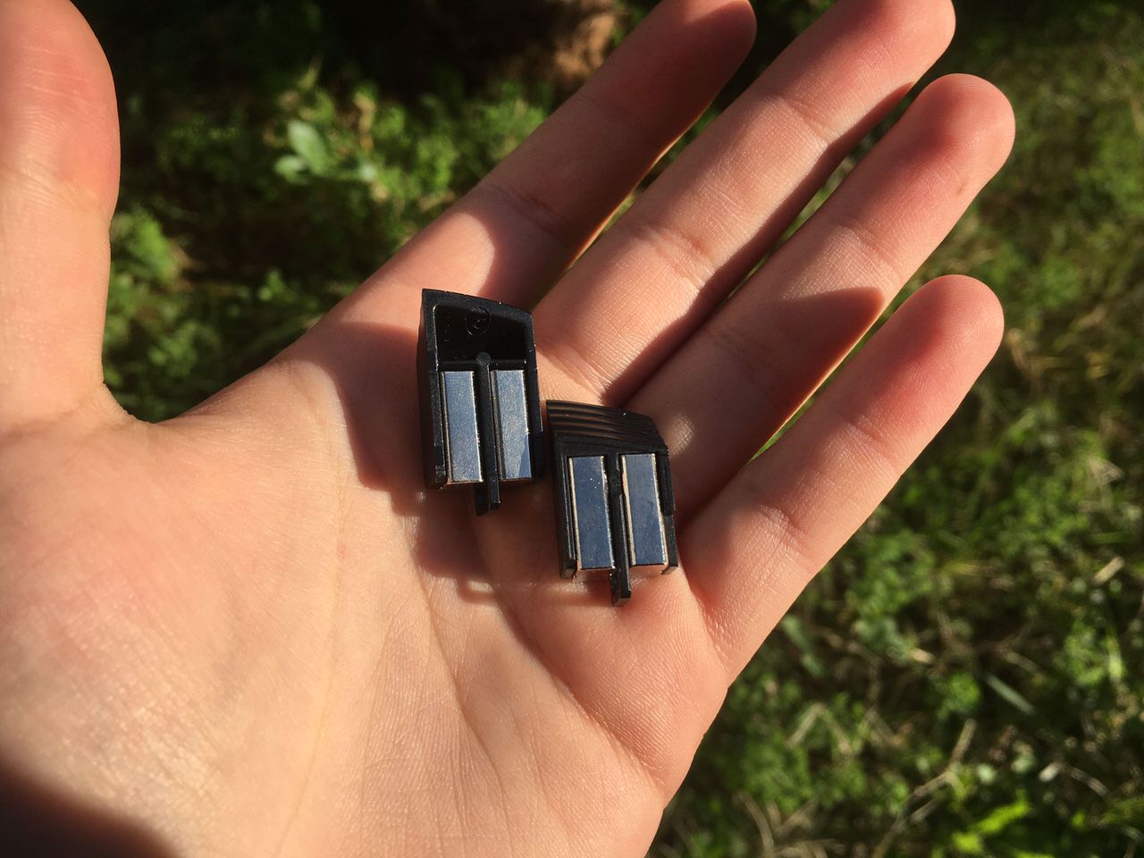 Görselde Alienware AW959 mouse’a entegre şekilde gelen iki makro tuşlu eklentiyi ve diğer sağ eklentiye nazaran daha küçük olan sağ eklentiyi görüyorsunuz. Her iki eklentide de mıknatıslar bulunmakta, bunun yanısıra 2 makro tuşunun bulunduğu eklentide 4 pinlik kısım bulunmakta.