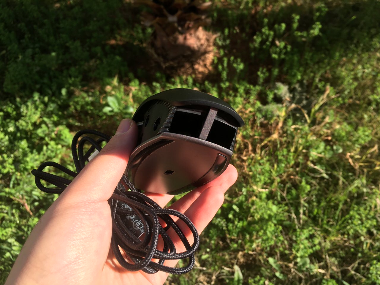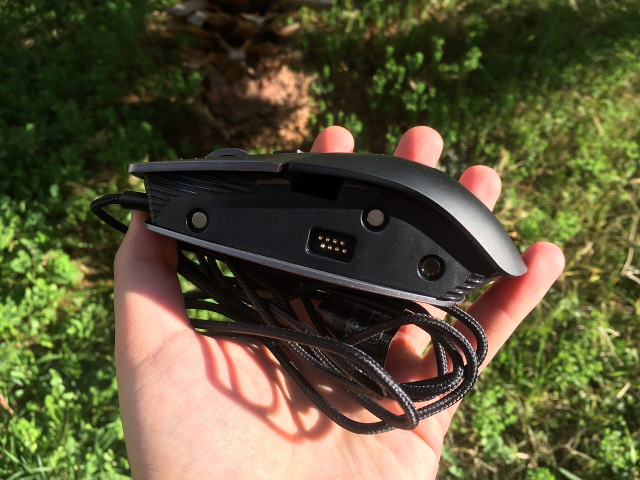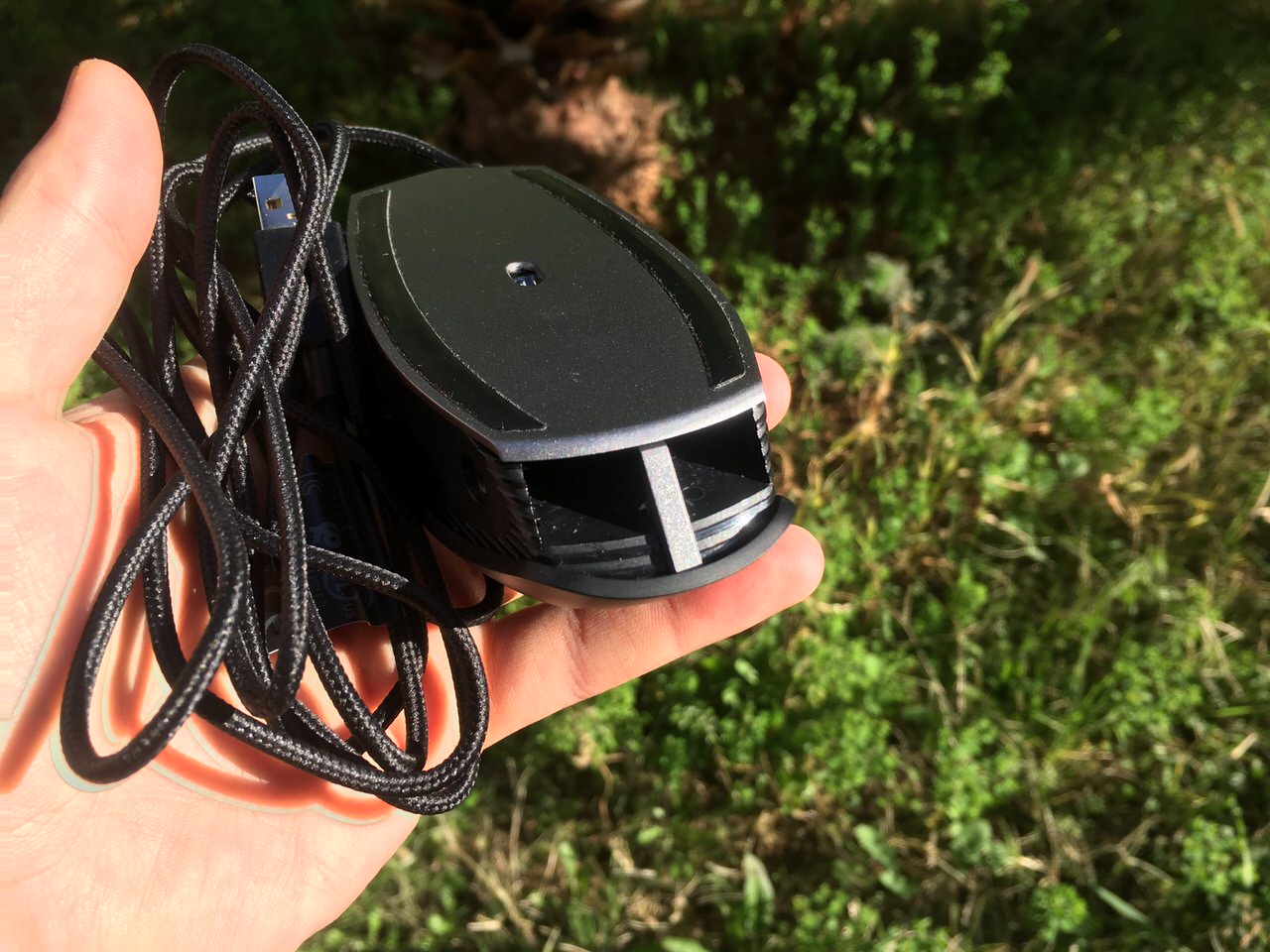 Alienware AW959 mouse’un alt kısmı bana biraz antipatik geldi. Optik sensörünü görebildiğimiz bu alt kısmın günlük kullanımda gözükmediği için her ne kadar çirkin olduğunu düşünsem de bir eksi yönünün bulunduğunu düşünmüyorum. Bunun yanısıra mouse’un 1.8m örme kablosunu bu görselden görebiliyoruz.