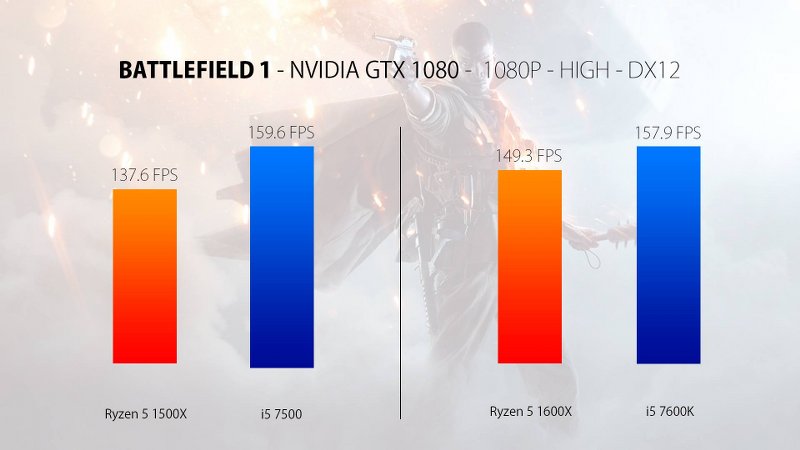 Gelelim bir diğer oyun testimize yine GTX 1080 ile yaptığımız 1080P HIGH ayar ve DX 12 API’siyle yaptığımız Battlefıeld 1 testine. Buradaki değerler ise Watch Dogs 2 testimizle oldukça benzerlik gösteriyor test işlemcimiz 1600X rakibi i5-7600K’dan ortalama 8 FPS daha düşük bir değer veriyor.