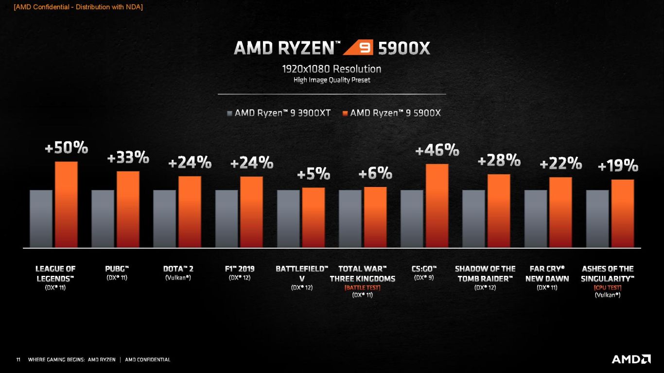 AMD Ryzen 9 5900X’in oyun performansı ise tek çekirdekteki gelişimi gözler önüne seriyor. Full HD çözünürlük baz alınarak yapılan karşılaştırmalarda R9 5900, selefi R9 3900XT modeline göre ortalama %26 performans artışı sağlıyor. Yine işlemcinin Intel tarafındaki rakibi Core i9-10900K’ya göre pek çok oyunda daha iyi performans sergilediği iddia ediliyor.