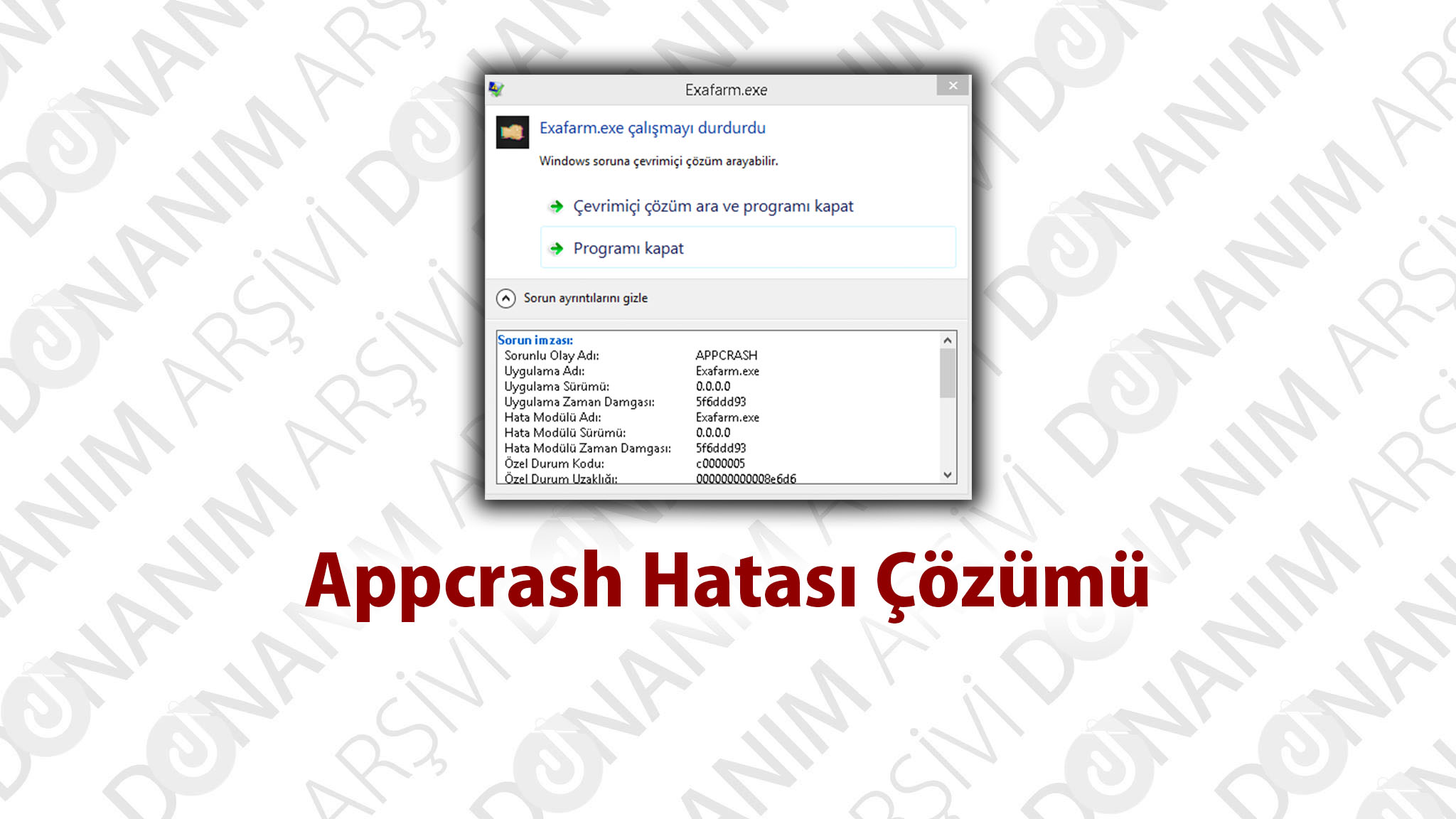Appcrash hatası olarak bilenen bu hata genellikle karşınıza açmaya çalıştırılan programın adı ile gelmektedir; …… Çalışmayı Durdurdu şeklinde karşınıza çıkmaktadır. Alınan hatanın içerisinde hata sebepleri belirtilebileceği gibi hata kodu da bulunabilmektedir.
