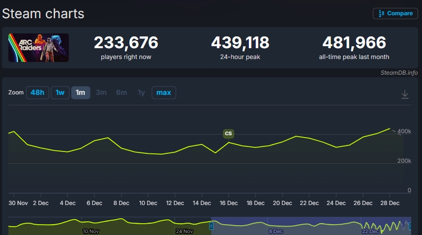 Arc Raiders, çıkış gününde Steam üzerinde yaklaşık 253 bin oyuncuya ulaştı. Ancak oyun hakkında olumlu geri bildirimlerin yayılması ve oyuncuların yapımı keşfetmesiyle birlikte bu sayı hızla arttı. Sadece bir hafta içinde Arc Raiders’ın eş zamanlı oyuncu sayısı 400 binin üzerine çıktı ve bu seviyeden sonra da ciddi bir gerileme yaşanmadı. SteamDB verilerine göre oyun, zirvesini çok daha yukarı taşımamış olsa da neredeyse her gün 400 binin üzerinde oyuncuyu kendine çekmeyi başarıyor. Bu da Arc Raiders’ın güçlü bir oyuncu sadakati oluşturduğunu gösteriyor.
