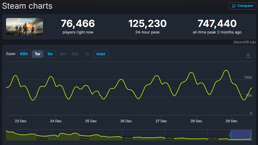 Battlefield 6 tarafında ise durum oldukça farklı. Oyun, lansman döneminde ulaştığı yaklaşık 750 bin eş zamanlı oyuncu sayısından sonra istikrarlı bir düşüş yaşamaya başladı. Ekim ayının sonunda birinci sezonun başlamasıyla birlikte kısa süreli bir toparlanma görüldü ve Battlefield 6 yeniden yaklaşık 500 bin oyuncuya ulaştı. Ancak bu artış kalıcı olmadı ve sezonun ardından oyuncu sayıları tekrar aşağı yönlü bir grafik çizmeye devam etti.
