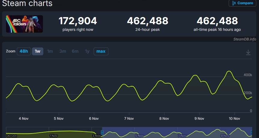 Embark Studios’un dikkat çekici nişancı oyunu ARC Raiders, piyasaya çıkışının üzerinden yalnızca on gün geçmiş olmasına rağmen oyuncu ilgisini kaybetmek bir yana, her geçen gün daha da güçleniyor. Kıyamet sonrası bir evrende geçen bu üçüncü şahıs nişancı yapımı, kısa sürede Steam’de büyük bir patlama yaşadı ve bugün itibarıyla 462.488 eşzamanlı oyuncuya ulaşarak kendi rekorunu bir kez daha kırdı. Bundan sadece kısa bir süre önce, oyunun en yüksek oyuncu sayısı 416.517 olarak kaydedilmişti.