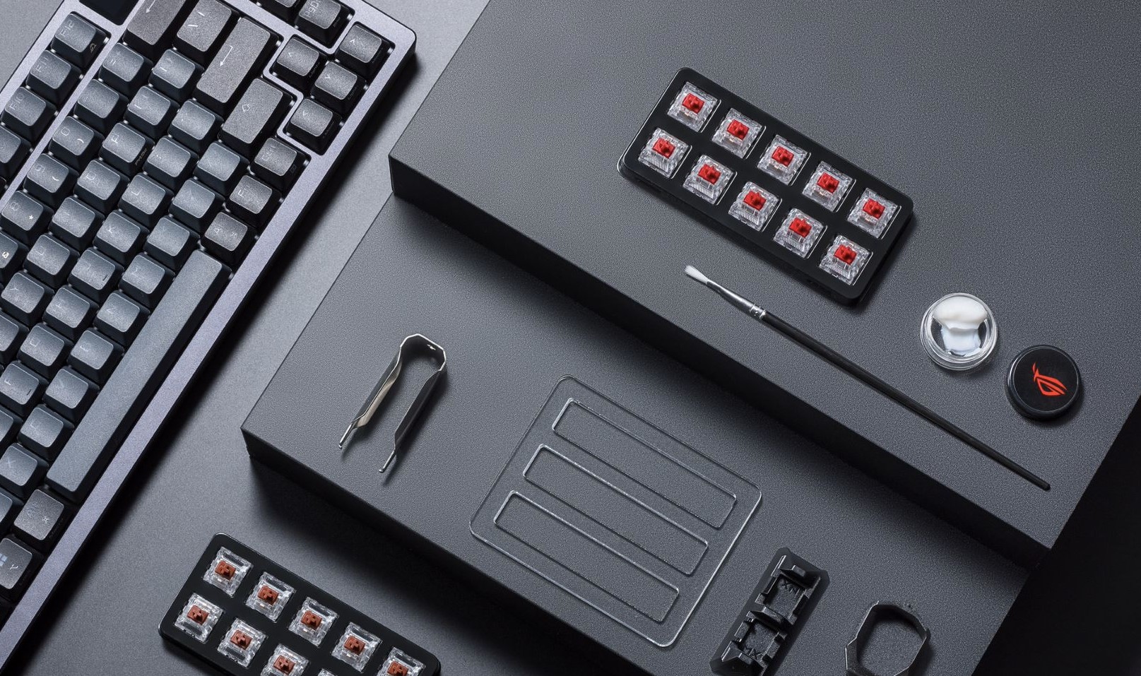ROG Azoth, klavyesini kendine özel hale getirmek isteyenler için ideal bir model. Ürünle birlikte gelen aksesuarlar arasında Krytox™ GPL-205-GD0 yağ, üç ek anahtar, tuş başlığı ve anahtar çıkarma aleti, anahtar açma aleti ve anahtarlar için yağlama rafı bulunuyor.