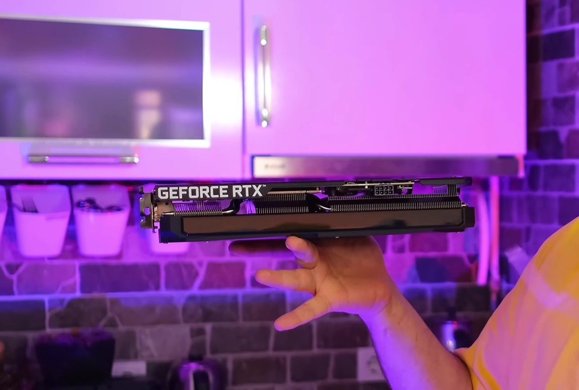 Ekran kartını anakarta taktığınızda size bakan tarafı gerçekten çok şık tasarlanmış. Burada altta gördüğünüz o kısımda Asus’un yeni RGB aydınlatması bulunuyor. Ayrıca bu açıdan bakıldığında soğutucu bloğun büyüklüğü rahatlıkla göze çarpıyor. Sadece bununla kalmayıp PCB’nin üzerindeki VRAM yongaları ve güç bileşenlerinin de soğutulduğunu görüyoruz.