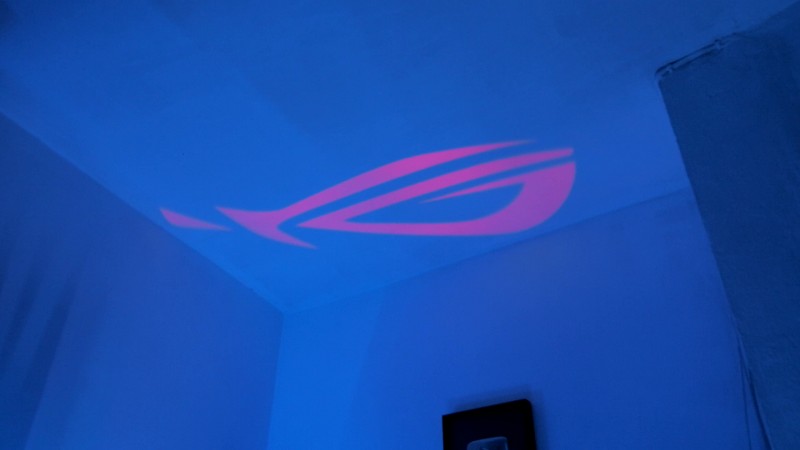 Standın üst kısmında ise cihazın en çarpıcı özelliklerinden biri olan yansıtmalı ROG gözü bulunuyor. Bu kısım ile birlikte altta bulunan ayar yardımıyla bu ROG gözünü duvara yansıtmanız sağlanmış. Böyle bir özellik gerçekten şaşırtıcı oluyor açıkçası.
