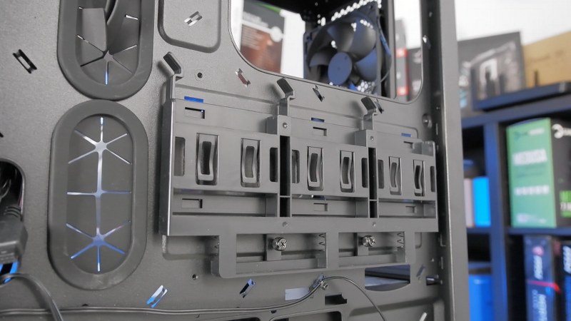 Kasanın sağ kapağını kaldırdığımızda kauçuk kablolama deliklerinin yanında 3 adet çıkarılabilir yaylı 2.5 inç disk yuvası görüyoruz. Bu yuvaların bol tutulması güzel bir detay olmuş. Ayrıca burada kablolama boşluklarının her anakart boyutuna göre detaylıca konumlandırıldığını görüyoruz, böylece kasa kablolama açısından gerçekten çok iyi olmuş.