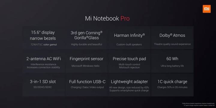 15.6 inç ekran boyutuna sahip Xiaomi Mi Notebook Pro, dar yan çerçeveleri sayesinde 13.3 inç boyutundaki standart bir bilgisayar ile aynı yeri kaplıyor. Full HD çözünürlüklü olan ekran Corning Gorilla Glass 3 ile korunuyor. Tamamen metal gövdeli laptop, 15.9 mm’lik inceliği ve 1.95 kg’lık ağırlığı ile dikkat çekiyor. Ayrıca aydınlatmalı klavye ve parmak izi okuma özellikli touchpad de ürünün güzel özellikleri arasında yer alıyor.