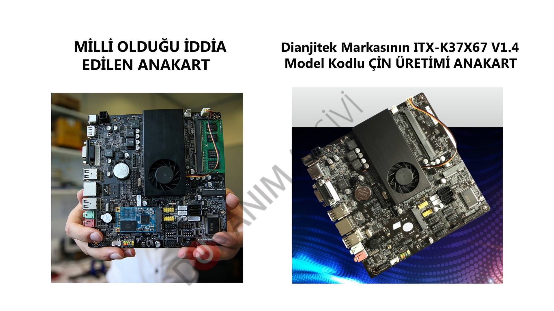 Araştırmalarımız sonucunda yerli olduğu iddialı edilen anakartın Çin’in anakart üreticilerinden biri olan Dianjitek firmasının ITX-K37X67 V1.4 model anakartıyla birebir aynı tasarıma sahip olduğunu fark ettik. Görüldüğü üzere birkaç portun rengi hariç anakart birebir aynı görünüyor. Genç anakartın Intel i3-i5-i7 modellerinin de yapılacağını iddia etmişti fakat çeşitli sitelerde aynı anakartın Celeron model işlemci gibi daha fazla çeşide sahip olduğunu gördük.
