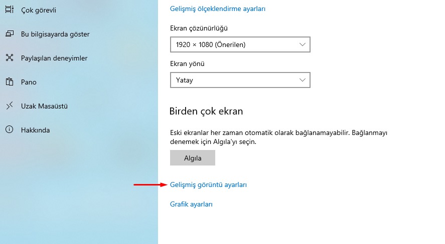 Açılan pencerenin biraz aşağılarında “Gelişmiş Görüntü Ayarları” isimli bir kısım göreceksiniz oraya tıklayın. Orada görüntü bilgileri bölümü altında aktif olan çözünürlüğünüzü ve ekran tazeleme hızınızı görüntüleyebilirsiniz.