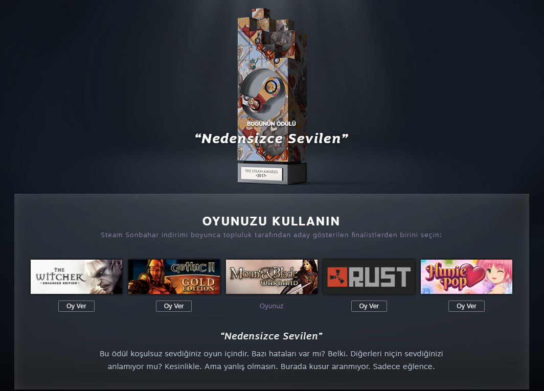Steam Awards eğlenceli kategorileriyle dikkat çeken ve dünyanın dört bir yanındaki Steam kullanıcılarının kategorilere oy vermesiyle öne çıkan bir ödül etkinliği.