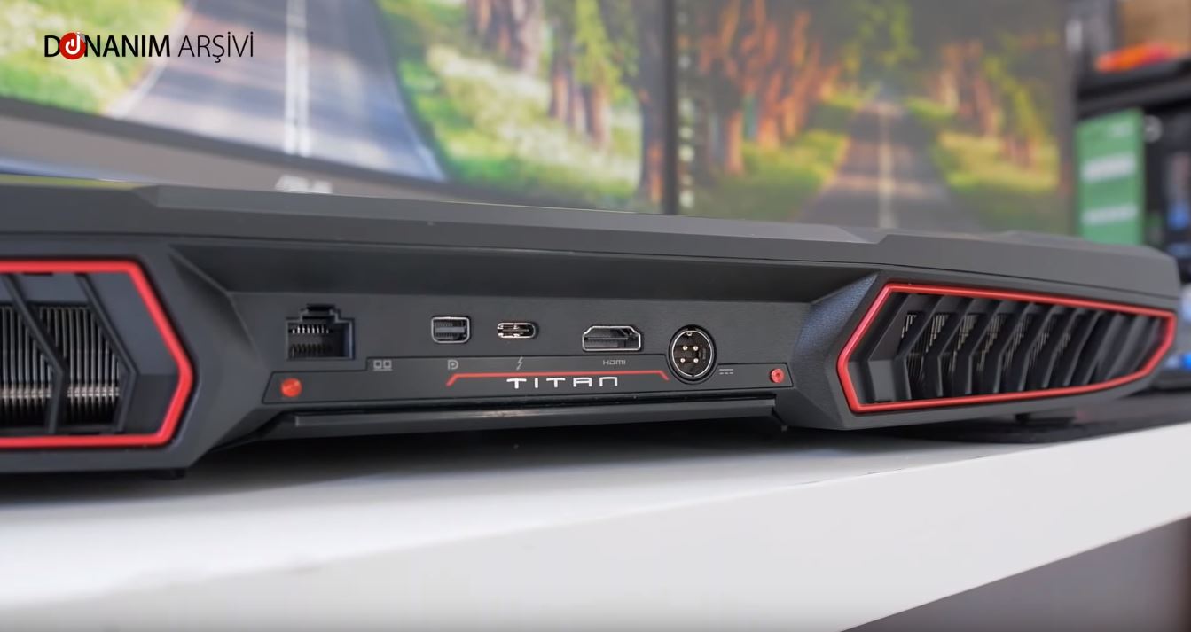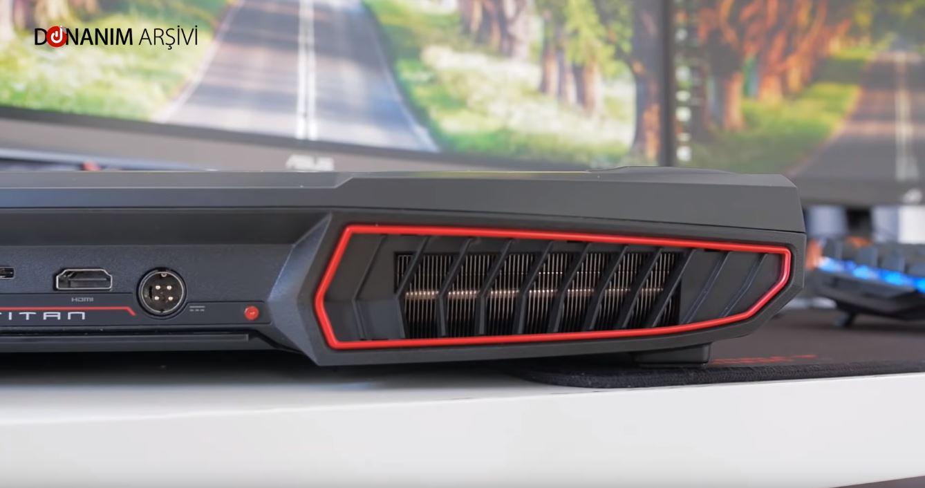 Cihazın arka tarafına baktığımızda Titan serisinin tasarım izlerinin devam ettiğini görüyoruz. Kalın ızgaralara yer vermek için MSI, hava çıkışını cihazın arka kısmına doğru vermeyi tercih etmiş. Sağda ve solda kalan hava tahliye kısımlarının etrafını kırmızı şeritle kaplayan MSI spor araba görünümüne benzer şık bir görüntü elde etmeyi başarmış.