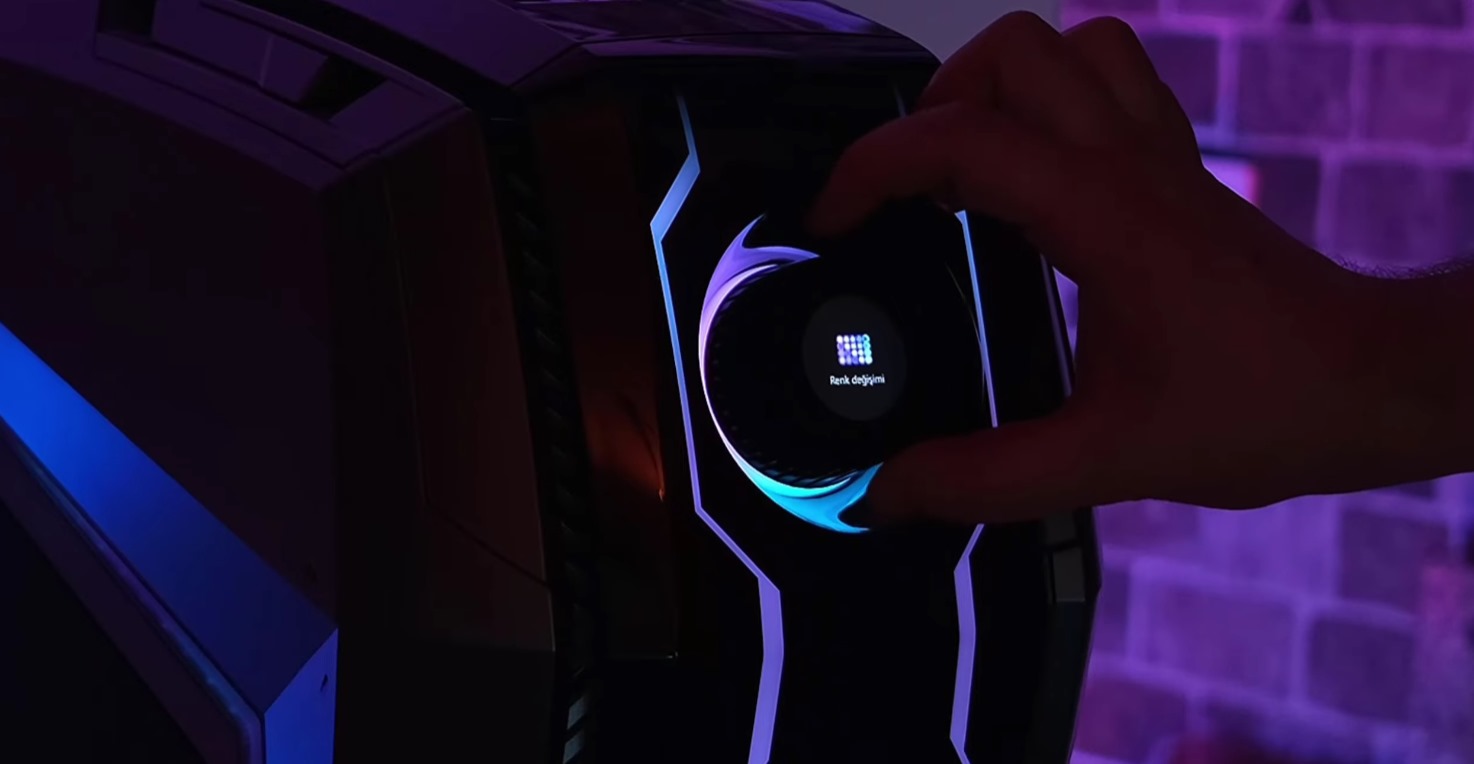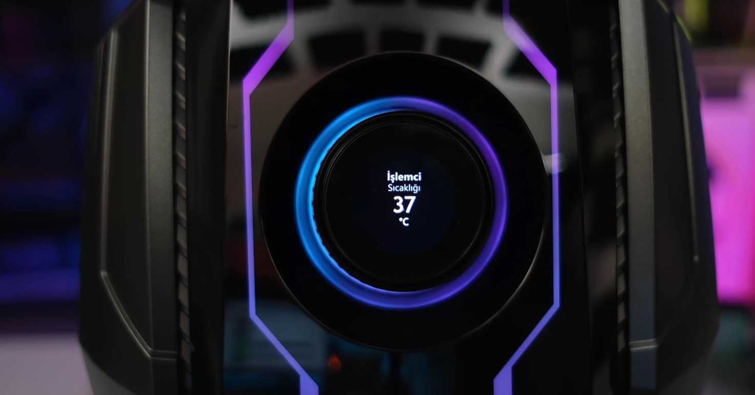 Bu kasanın tasarımının en büyük farklılığı olduğundan bahsetmiştik. Bu tasarımdaki en dikkat çekici şey ise kasanın ön tarafındaki ekran ve çok işlevli tekerlek bölümü. Dilerseniz bu ekrana görsel, GIF koyabiliyorsunuz. Bunun yanı sıra sistemin anlık sıcaklık değerlerini, kullanımlarını gösterebiliyor, hatta hava durumunu bile gösterebiliyor bu LCD ekran. Açıkçası bu bilgisayarın en ilgi çeken yeri burası olmuş, çünkü bu tarz bir tasarım görmek heyecan verici.