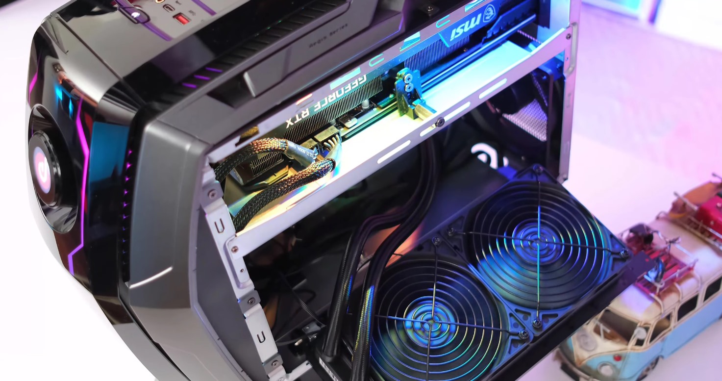 Sağ taraftaki kapağı açtığınızda ise sizi Core i7-10700K işlemciyi soğutmakla görevli olan 240 MM sıvı soğutmanın radyatörü karşılıyor. Aslına bakılırsa zaten böylesine sınırlı bir alanda 240MM sıvı soğutucu kullanılması çok güzel bir hamle, çünkü Core i7-11700K işlemci gerçekten güçlü ve ısınan bir model. Bu soğutmanın başarısına ise yazının devamında değiniyor olacağız, sonuçlar bir hayli şaşırtıcı.