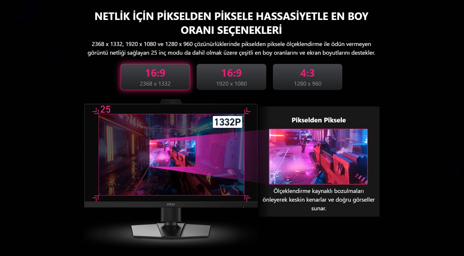 Zirve performansta uzun yıllar çalışmayı garantilemek için MPG 272QRF X36, NVIDIA tarafından sunulan firmware güncellemelerini kullanıcının doğrudan almasına olanak tanıyor. Performansın ötesinde bu monitör, kişiselleştirilmiş bir görsel deneyim için gelişmiş renk özelleştirmeleri sunar ve farklı kullanım senaryolarına uyum sağlamak için çeşitli en/boy oranlarını destekler. Bunlar arasında, seçilen format ne olursa olsun görüntü berraklığından taviz vermemek için 2368 x 1332, 1920 x 1080, ve 1280 x 960 çözünürlüklerde 25 modlu piksel bazlı ölçeklendirme simülasyonu da mevcut.