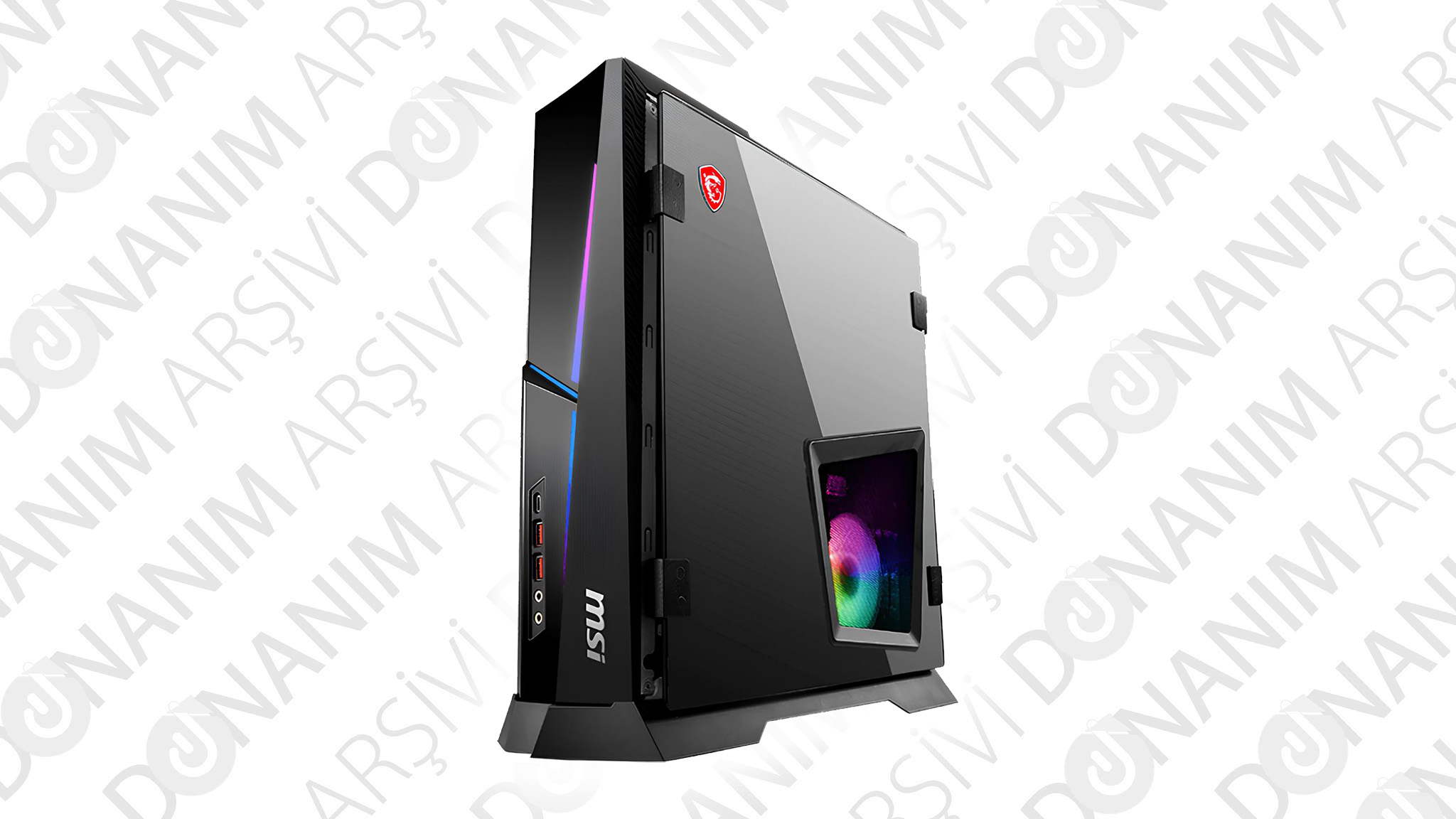 Kasanın ön tarafının bir kısmı parlak yapıdayken diğer tarafı ise mat bir yapıda. Hemen bu birleşim yerlerine ise MSI RGB aydınlatma koymayı ihmal etmemiş. Bu aydınlatmada da MSI Mystic Light desteği bulunuyor. Yani diğer donanımlarla/ekipmanlarla uyumlu şekilde çalışabiliyor.