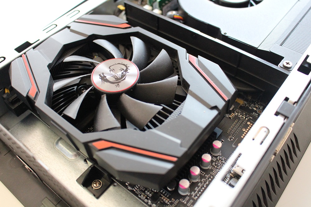 MSI ekran kartını cihazın içerisine sığdırabilmek için anakartın üzerine doğru yatırmış. Bu kısımda özel bir işçilik uygulandığını belirtmekte fayda var. Cihazın ön tarafında ısınan havanın dışarı atılması için bir tasarım uygulandığını belirtmiştik. Ekran kartının fanı da buraya bakıyor.