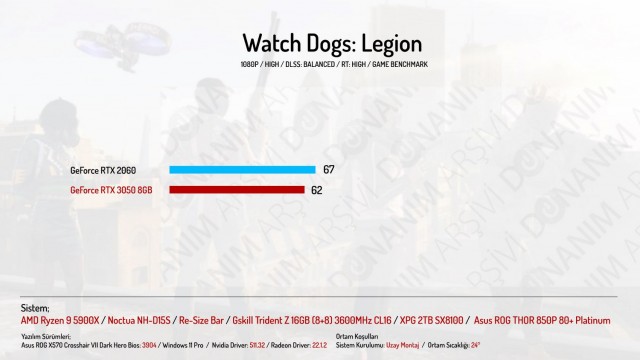 Asus ROG Strix RTX 3050 8 GB ekran kartının son oyun testini Watch Dogs: Legion ile yaptık. Yine ışın izleme açık ve kapalı olacak şekilde iki farklı testi sizlere sunuyoruz. Yüksek grafik ayarlarında ışın izleme kapalıyken ve DLSS kalite modundayken 98 FPS gibi gayet iyi bir değer aldık. Işın izleme yüksek ayardayken yaptığımız testlerde ise 62 FPS almayı başardık. Yine RTX 2060 modeliyle aralarındaki fark korunmuş.