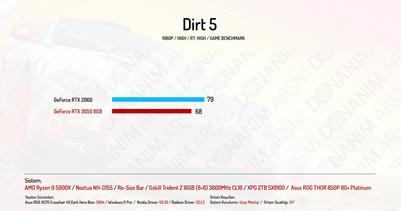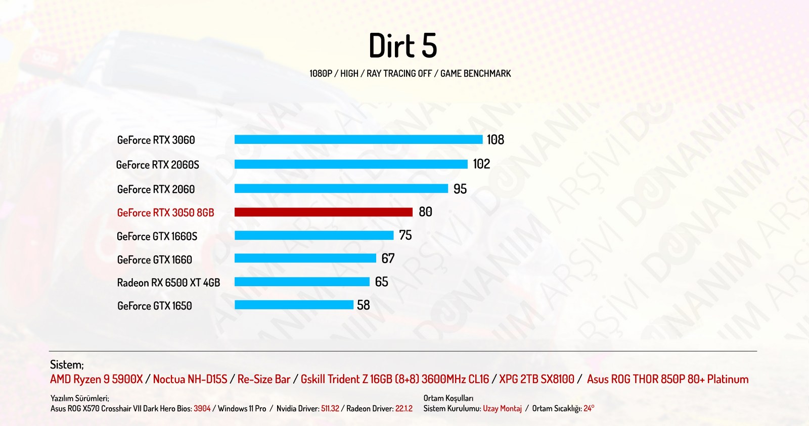 Dirt 5 oyununda hem normal halde hem de ışın izleme açık halde testler yaptık. 1080P çözünürlük, yüksek ayarlarda ışın izleme kapalıyken 80 FPS alarak yine 1660 Super ekran kartının önünde bir değer aldı. Işın izleme açıkken ise 68 FPS’e kadar düştü değerler fakat yine güzel bir sonuç.