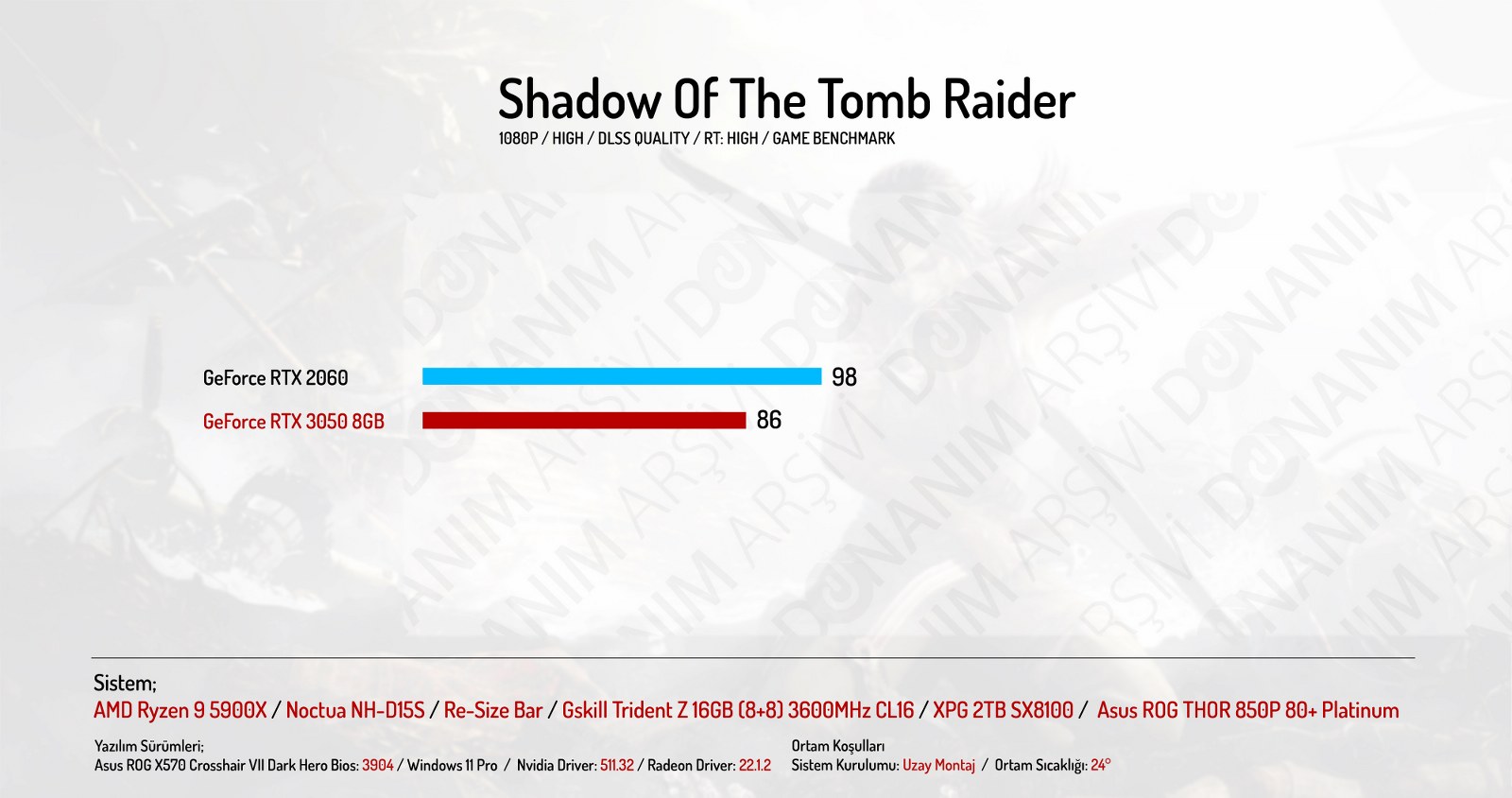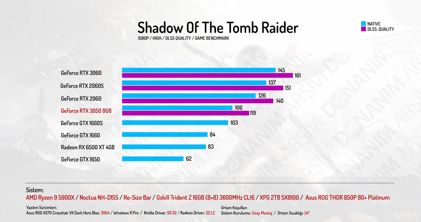 RTX 3050 8 GB ekran kartını Shadow of the Tomb Raider oyununda 2 farklı senaryoda test ettik. Işın izleme kapalı, DLSS ayarı kalitedeyken yaptığımız testte 119 FPS değerini elde ettik. Işın izlemeyi yüksek ayara getirdiğimiz zaman ise bu değer 86’ya kadar düştü.