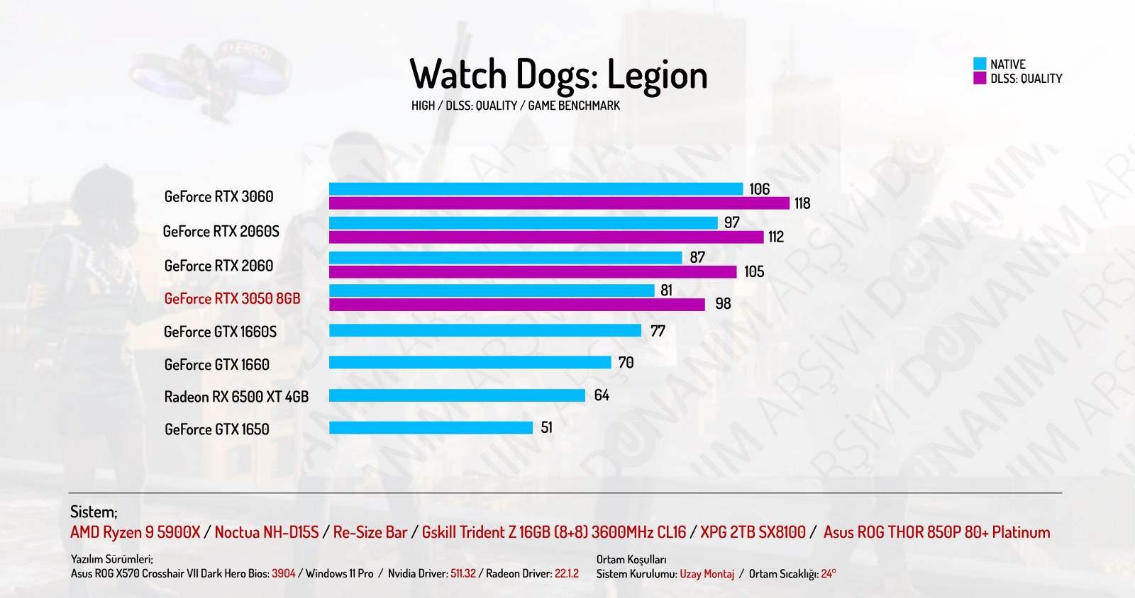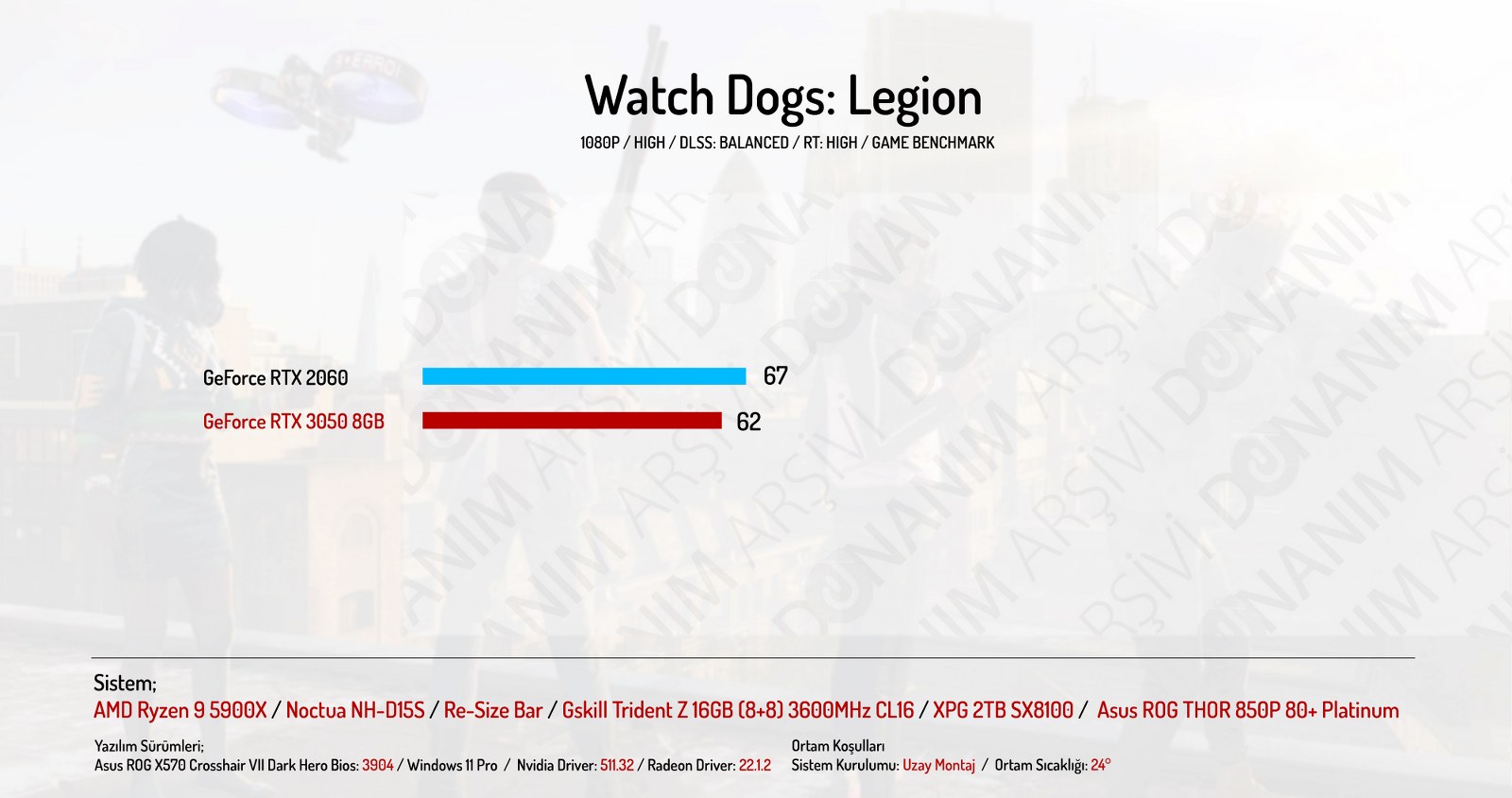 Asus ROG Strix RTX 3050 8 GB ekran kartının son oyun testini Watch Dogs: Legion ile yaptık. Yine ışın izleme açık ve kapalı olacak şekilde iki farklı testi sizlere sunuyoruz. Yüksek grafik ayarlarında ışın izleme kapalıyken ve DLSS kalite modundayken 98 FPS gibi gayet iyi bir değer aldık. Işın izleme yüksek ayardayken yaptığımız testlerde ise 62 FPS almayı başardık. Yine RTX 2060 modeliyle aralarındaki fark korunmuş.