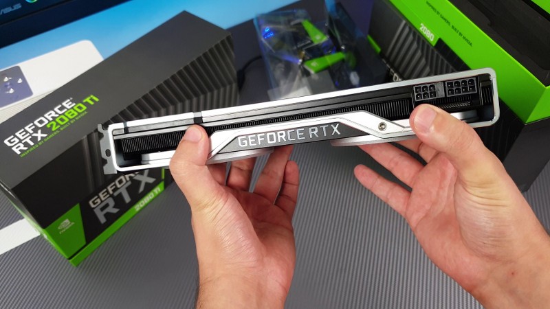 Karta üstten baktığımızda metal plakanın kartı boylu boyuna sardığını görmek mümkün. Orta kısımda ise yeşil aydınlatmaya sahip GeForce RTX yazısı konumlandırılmış. Bu açıdan baktığımızda ekran kartının soğutma bloğunu net biçimde görüyoruz, ekran kartını boylu boyuna kaplayan bu plaka buhar bölmesi sayesinde önceki nesillere göre çok daha iyi bir soğutma sunacak gibi görünüyor.
