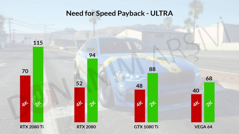 Yarış oyunlarının başarılı temsilcilerinden Need for Speed Payback’de ise yine Ultra ayarlarda RTX 2080 Ti 70 FPS gibi oldukça iyi bir FPS almayı başarıyor. Diğer oyunların aksine bu oyunda RTX 2080 ve GTX 1080 Ti arasındaki eşitlik bozularak ortalamada 4-5 FPS civarlarında bir RTX 2080 üstünlüğü oluşuyor. VEGA 64 ise en yakın rakibinden 8 FPS daha düşük sonuç alıyor.