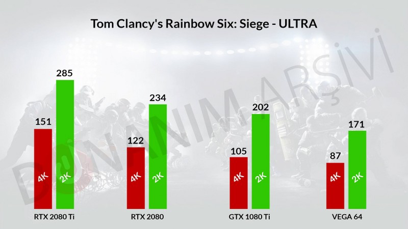Online bir oyun olduğu için diğerlerine göre daha hafif sayılabilecek bir oyun olan Tom Clancy’s: Rainbow Six Siege testinde ise bütün ekran kartları 4K 60 FPS barajını rahatlıkla açıyor. RTX 2080 Ti 4K çözünürlükte 151 FPS gibi çok yüksek bir değer alırken diğer tarafta eşitlik yine bozularak RTX 2080’in GTX 1080 Ti karşısında ortalama olarak 20 FPS gibi bir değerle öne geçtiğini görüyoruz. VEGA 64 ise 87 FPS gibi oldukça akıcı bir FPS değeri almasına rağmen yine testte en geride yer alıyor.