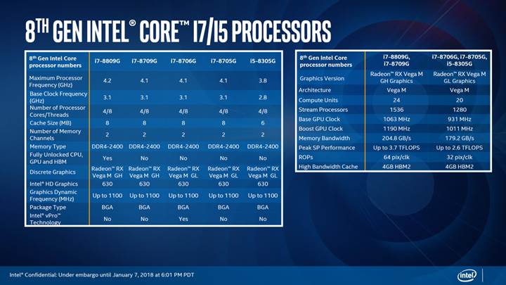 Intel ve Radeon, ilk olarak 5 adet model hazırlamış. Giriş seviyesi olarak Intel Core i5-8305G yer alıyor. Bu işlemci 2.8 GHz taban ve 3.8 GHz boost frekanslarına sahip. 8305G’nin bir üstünde Intel Core i7-8805G ve i7-8806G yer alırken, bu işlemciler 3.1 GHz taban ve 4.1 GHz boost frekanslarında çalışıyor. 4 çekirdek ve 8 izleğe sahip bu işlemcilerde 4 GB HBM 2 belleğe sahip Vega M GL grafik birimi yer alırken, bu paketin TDP’si 65W olarak belirlenmiş.