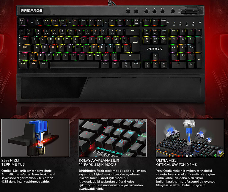 Yeni incelememizin konuğu Rampage’in dünyanın en hızlı switchlerine sahip yeni oyuncu klavyesi olan Hydra R7 modeli oluyor. Klavyeyi bu kadar özel yapan şey ise kullanılan Optik Switchler oluyor.