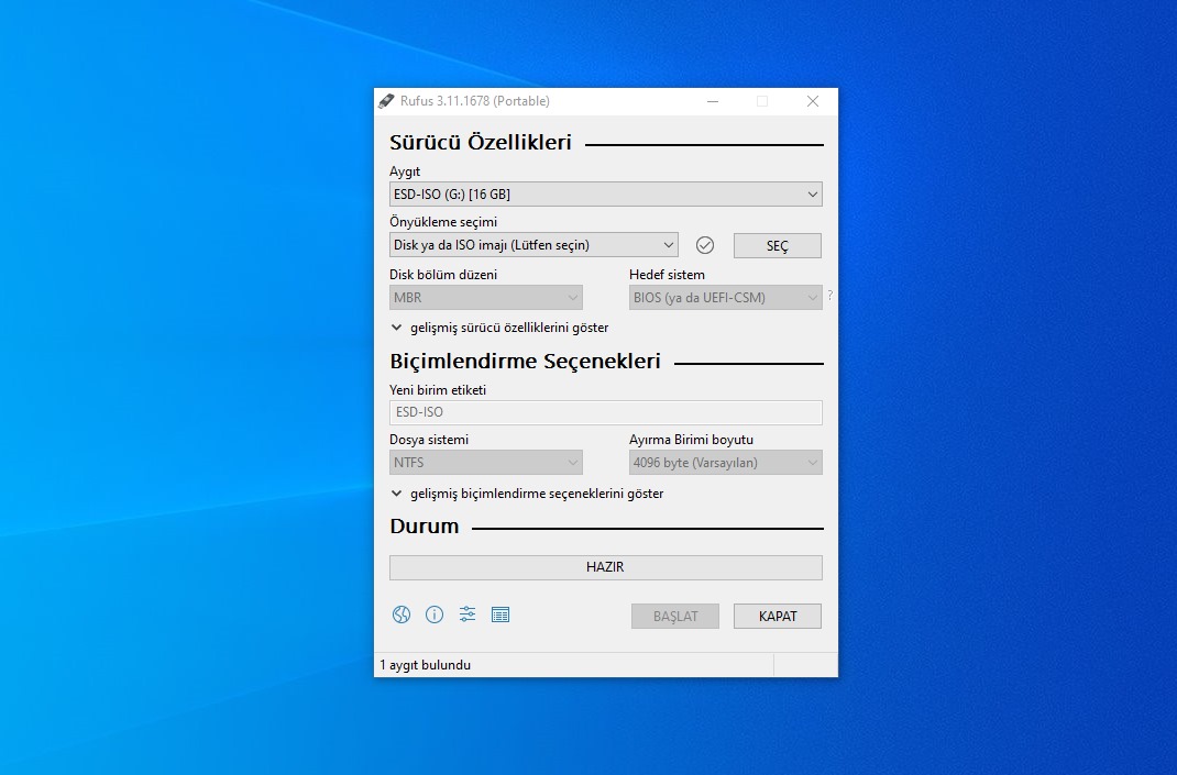 “Disk bölüm düzeni” buradaki en önemli kısımlardan biri. Eğer “GPT” seçeneğini seçerseniz sadece daha güncel olan UEFI BIOS tipine uygun olan türde USB diskiniz hazırlanacaktır. “MBR” seçeneği seçtiğiniz takdirde ise hem eski tip Legacy hem de yeni tip UEFI BIOS’a uygun olacak şekilde USB diskiniz hazırlanacaktır.