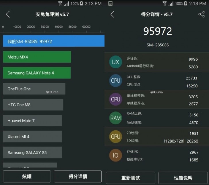 Samsung tarafından alenen hangi model isme sahip olduğu belirtilmeyen rekortmen cihazı SM-8508S model koduna sahipken Samsung Galaxy Alpha ismine sahip olacağı konusunda düşünülüyor. Daha önceki AnTuTu rekorlarıda 70Bin sınırıyla Samsung’a aitti ve yine 96Bin Puan ile Samsung bayrağı göğüslerken Hangi model ismine sahip olduğunun açıklanmadığını tekrar belirtelim. İşlemci tarafında Exynos kullanılacağı düşünülürken gelecek olan akıllı cep telefonun bir amiral gemi cihazı olmayacağından ötürü 720p ekrana sahip bir cihazın 96Bin AnTuTu puan aldığını düşünüyoruz ki bu noktada da cihazın güçlü bir işlemciye sahip olacağı şüphesiz. Aşağıdan basına sızdırılan AnTuTu görüntüsünü görebilirsiniz.