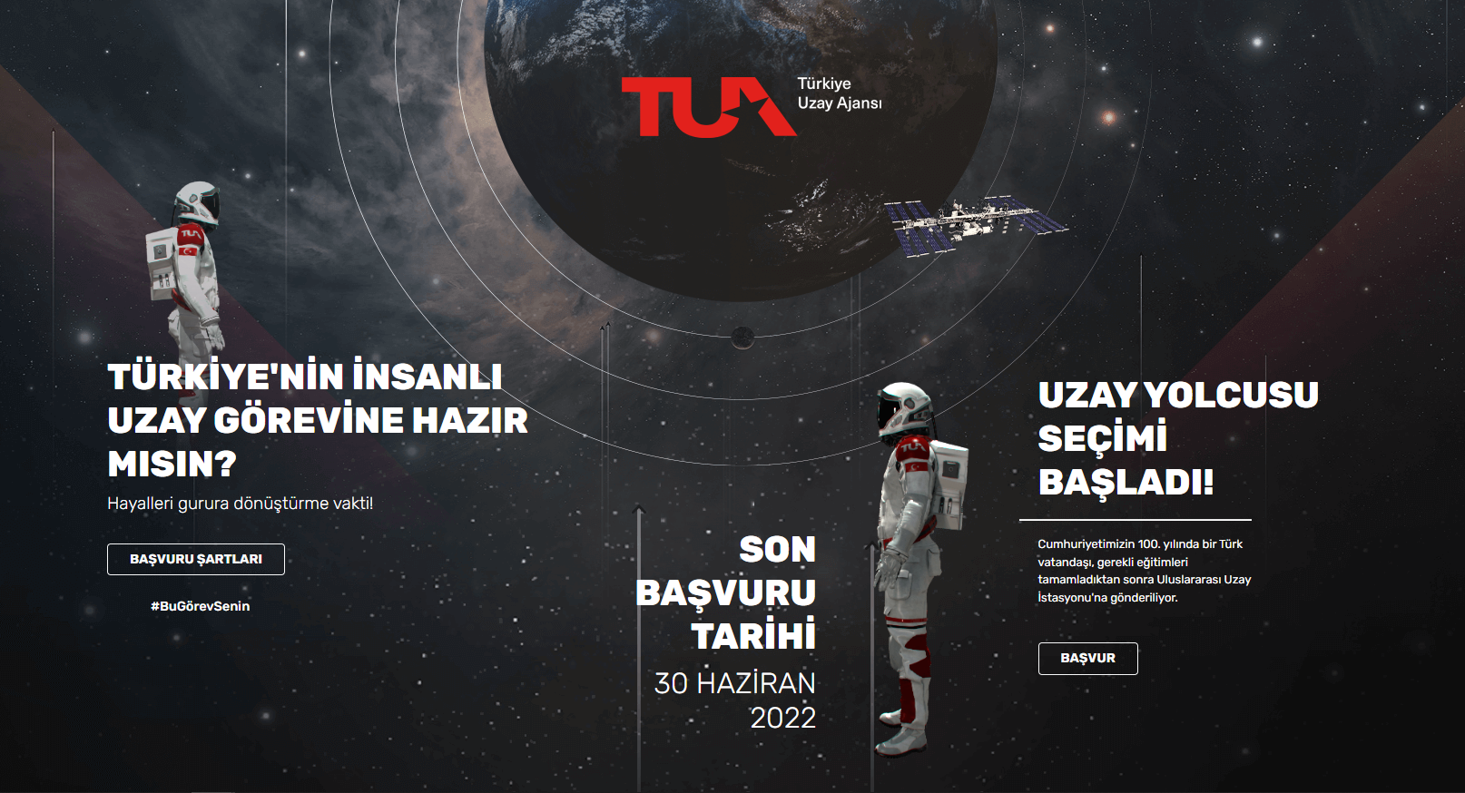 Türkiye Uzay Ajansı’nın (TUA) Uluslararası Uzay İstasyonu’na göndereceği ilk uzay yolcusu olabilmek için, 30 Haziran 2022 tarihine kadar uzay.gov.tr üzerinden belirtilen şartları sağlayıp kayıt yaptırmış olmanız gerekiyor.